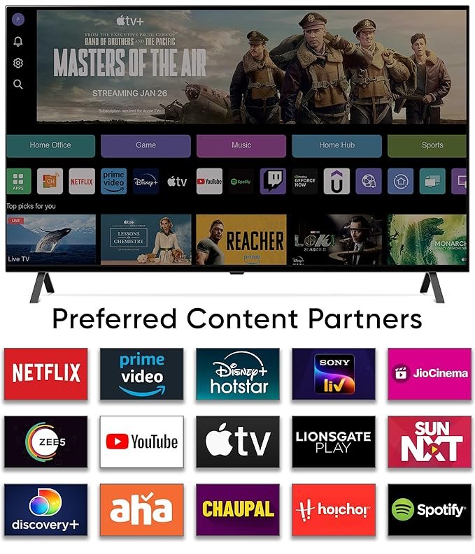 Smart TV Features: WebOS Smart TV | AI ThinQ | Built-in Alexa, Matter, Apple Airplay 2 & Homekit | Game Optimizer| Filmmaker Mode | α7 AI Processor 4K Gen6 | HDR 10 |2 GB RAM + 8 GB Storage | Magic Remote | Unlimited OTT App Support: Netflix, Prime Video, Disney+ Hotstar, Apple TV, Jio Cinema, SonyLIV, Discovery+, Zee5, Voot, MxPlayer, Google Play Movies & TV, YuppTV, Youtube